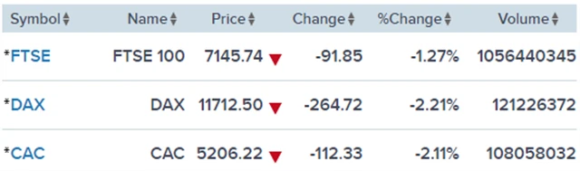 Regionální index STOXX Europe 600 odepsal 1,61 % na 366,93 bodu, britský FTSE 100 se snížil 1,27 % na 7 145,74 bodu, francouzský CAC 40 oslabil o 2,11 % na 5 206,22 bodu a německý DAX spadl o 2,21 % na 11 712,5 bodu. Nejvýrazněji klesly sektory technologií a základních materiálů.