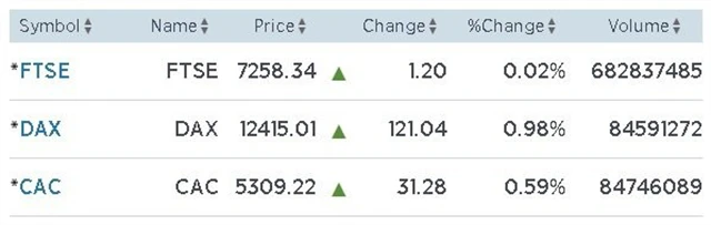 Celoevropský index STOXX Europe 600 vzrostl o 0,7 %. Index londýnské burzy FTSE 100 skončil na zelené nule se ziskem 0,02 %, německý DAX si připsal 0,98 % a francouzský CAC 40 si polepšil o 0,59 %. V plusu byla většina hlavních sektorů.