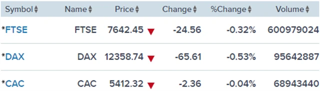 Regionální index STOXX Europe 600 odepsal 0,16 % na 385,23 bodu, britský FTSE 100 klesl o 0,32 % na 7 642,45 bodu, francouzský CAC 40 přišel o 0,04 % na 5 412,32 bodu a německý DAX oslabil o 0,53 % na 12 358,74 bodu.