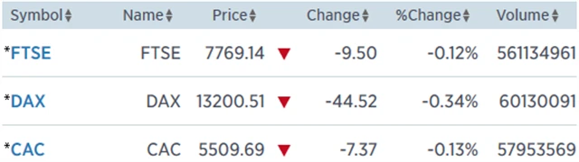 Regionální index STOXX Europe 600 odepsal 0,17 % na 397,81 bodu, britský FTSE 100 přišel o 0,12 % na 7 769,14 bodu, francouzský CAC 40 ztratil 0,13 % na 5 509,69 bodu a německý DAX klesl o 0,34 % na 13 200,51 bodu.