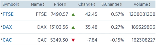 Regionální index STOXX Europe 600 odepsal 0,19 % na 388,19 bodu, za celý týden pak klesl o 0,27 %. Britský FTSE 100 stoupl o 0,57 % na 7 490,57 bodu (za celý týden +1,31 %), francouzský CAC 40 odepsal 0,15 % na 5 349,3 bodu (za celý týden -0,92 %) a německý DAX vzrostl o 0,27 % na 13 103,56 bodu (za celý týden -0,38 %).