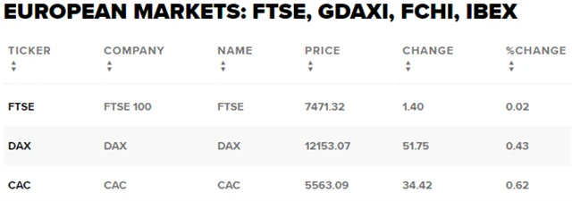 Regionální index STOXX Europe 600 posílil o 0,1 % na 389,59 bodu, britský FTSE 100 získal pouze 0,02 % na 7 471,32 bodu, francouzský CAC 40 zpevnil o 0,62 % na 5 563,09 bodu a německý DAX se zvýšil o 0,43 % na 12 153,07 bodu.