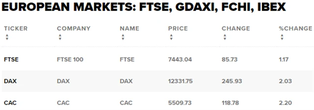 Regionální index STOXX Europe 600 zpevnil o 1,67 % na 384,78 bodu, když o necelá 3 % stoupl sektor základních materiálů. Britský FTSE 100 získal 1,17 % na 7 443,04 bodu, francouzský CAC 40 posílil o 2,2 % na 5 509,73 bodu a německý DAX se zvýšil o 2,03 % na 12 331,75 bodu.