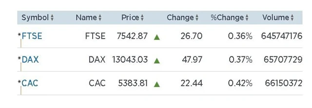 Celoevropský akciový index STOXX Europe 600 zakončil seanci se ziskem 0,29 procenta; většina jeho sektorů skončila v černých číslech. Hlavní index londýnské burzy FTSE 100 si připsal 0,36 procenta, německý DAX vystoupal o 0,37 procenta a francouzský CAC 40 si polepšil o 0,42 procenta.