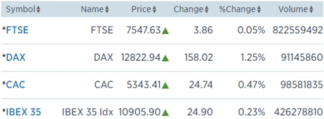 Regionální index STOXX Europe 600 si připsal 0,23 % na 392,55 bodu, za celý týden zpevnil o 0,31 %. Britský FTSE 100 krátce po otevření vystoupal na nové historické maximum 7 598,99 bodu, následně však mírně klesl a uzavřel se ziskem 0,05 % na 7 547,63 bodu (za celý týden, který byl z důvodu státního svátku ochuzen o pondělí, přišel o 0,09 %). Francouzský CAC 40 si polepšil o 0,47 % na 5 343,41 bodu (za celý týden +0,13 %) a německý DAX stoupl o 1,25 % na 12 822,94 bodu (za celý týden +1,75 %).