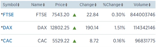 Regionální index STOXX Europe 600 vzrostl o 0,65 % na 387,54 bodu, britský FTSE 100 si připsal 0,3 % na 7 543,2 bodu, francouzský CAC 40 získal 0,16 % na 5 529,22 bodu a německý DAX zpevnil o 1,51 % na 12 802,25 bodu.