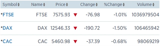 Regionální index STOXX Europe 600 oslabil o 0,82 % na 386,65 bodu, britský FTSE 100 odepsal 1,01 % na 7 575,93 bodu, francouzský CAC 40 klesl o 0,68 % na 5 460,98 bodu a německý DAX přišel o 1,5 % na 12 546,33 bodu.