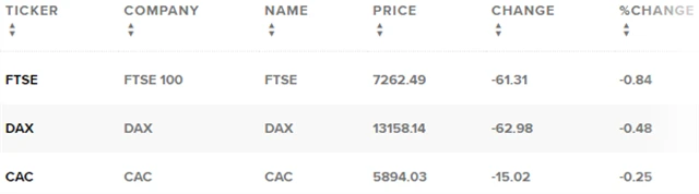Regionální index STOXX Europe 600 odepsal 0,41 % na 403,82 bodu, britský FTSE 100 klesl o 0,84 % na 7 262,49 bodu, francouzský CAC 40 přišel o 0,25 % na 5 894,03 bodu a německý DAX se snížil o 0,48 % na 13 158,14 bodu.