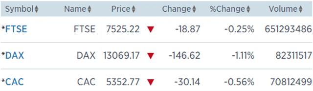 Regionální index STOXX Europe 600 odepsal 0,68 % na 388,37 bodu, britský FTSE 100 přišel o 0,25 % na 7 525,22 bodu, francouzský CAC 40 klesl o 0,56 % na 5 352,77 bodu a německý DAX ztratil 1,11 % na 13 069,17 bodu. Nedařilo se zejména sektorům technologií a zdravotní péče.