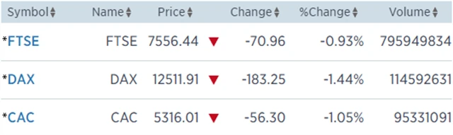 Regionální index STOXX Europe 600 přišel o 0,86 % na 380,97 bodu, britský FTSE 100 ztratil 0,93 % na 7 556,44 bodu, francouzský CAC 40 odevzdal 1,05 % na 5 316,01 bodu a německý DAX klesl o 1,44 % na 12 511,91 bodu.