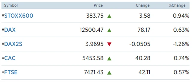 Panevropský akciový index STOXX Europe 600 přidal 0,94 % na 383,75 bodu, britský FTSE 100 vzrostl o 0,57 %, německý DAX posílil o 0,63 % a francouzský CAC 40 uzavřel se ziskem 0,74 %.