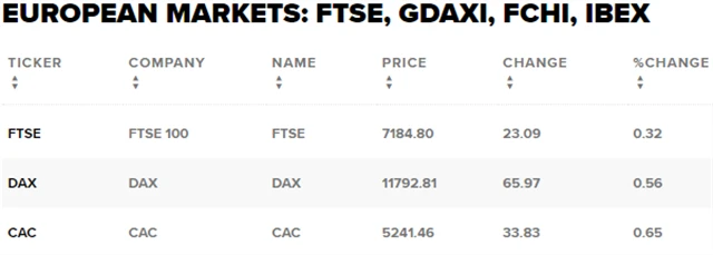 Regionální index STOXX Europe 600 vzrostl o 0,39 % na 370,49 bodu, britský FTSE 100 získal 0,32 % na 7 184,8 bodu, francouzský CAC 40 zpevnil o 0,65 % na 5 241,46 bodu a německá DAX posílil o 0,56 % na 11 792,81 bodu.