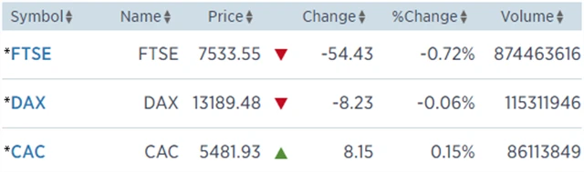 Regionální index STOXX Europe 600 přišel o 0,17 % na 395,46 bodu, britský FTSE 100 ztratil 0,72 % na 7 533,55 bodu, francouzský CAC 40 získal 0,15 % na 5 481,93 bodu a německý DAX odevzdal 0,06 % na 13 189,48 bodu.