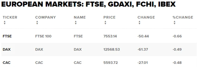 Regionální index STOXX Europe 600 odevzdal 0,72 % na 390,11 bodu, za celý týden však zpevnil o 1,36 %. Britský FTSE 100 klesl o 0,66 % na 7 553,14 bodu (týden: +1,72 %), francouzský CAC 40 odepsal 0,48 % na 5 593,72 bodu (týden: +0,99 %) a německý DAX se snížil o 0,49 % na 12 568,53 bodu (týden: +1,37 %).