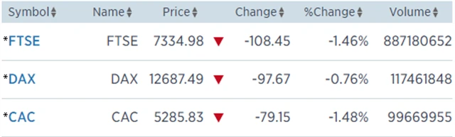 Regionální index STOXX Europe 600 přišel o 1,56 % na 382 bodů, když v mínusu obchodování zakončily všechny jeho sektory. Benchmark uzavřel na nejnižší hodnotě od listopadu loňského roku. Britský FTSE 100 odevzdal 1,46 % na 7 334,98 bodu, francouzský CAC 40 spadl o 1,48 % na 5 285,83 bodu a německý DAX klesl o 0,76 % na 12 687,49 bodu.