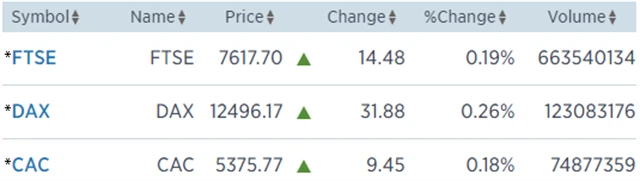 Regionální index STOXX Europe 600 stoupl o 0,12 % na 382,06 bodu, za celý týden pak zpevnil zhruba o půl procenta. Britský FTSE 100 získal 0,19 % na 7 617,7 bodu (týden: -0,25 %), francouzský CAC 40 vzrostl o 0,18 % na 5 375,77 bodu (týden: +0,98 %) a německý DAX posílil o 0,26 % na 12 496,17 bodu (týden: +1,55 %).