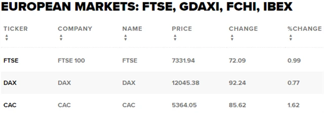 Regionální index STOXX Europe 600 vzrostl o 0,93 % na 377,48 bodu, za celý týden pak získal 2,28 %. Britský FTSE 100 se zvýšil o 0,99 % na 7 331,94 bodu (týden: +2,38 %), francouzský CAC 40 si připsal 1,62 % na 5 364,05 bodu (týden: +3 %) a německý DAX posílil o 0,77 % na 12 045,38 bodu (týden: +2,72 %).
