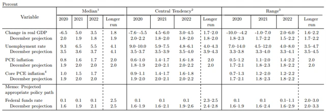 V nové prognóze Fed odhadl letošní propad ekonomiky Spojených států na 6,5 %. Příští rok by HDP měl ale vzrůst o 5 % a v roce 2022 by se měl zvýšit o 3,5 %. Inflace by letos měla dosáhnout 0,8 %, v příštím roce 1,6 % a v roce 2022 by měla činit 1,7 %. Míra nezaměstnanosti by letos měla skončit na 9,3 %, příští rok na 6,5 % a v roce 2022 by měla klesnout na 5,5 %.