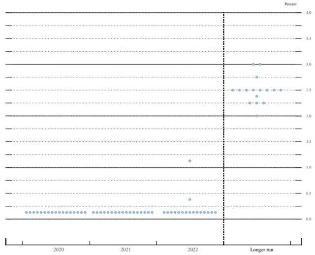 Prognóza vývoje úrokových sazeb (dot plot) předpokládá setrvání základního úroku na současných úrovních minimálně do konce roku 2022. V dlouhodobějším horizontu by se základní úroková sazba měla pohybovat kolem 2,5 %.