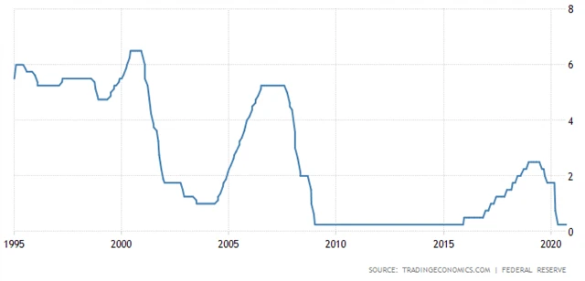 První snížení úrokové sazby Fedu v souvislosti s koronavirem přišlo 3. března (z 1,50-1,75 % na 1,00-1,25 %) a druhé 15. března (z 1,00-1,25 % na 0,0-0,25 %). Se snižováním sazeb banka začala již loni ve snaze ochránit ekonomiku před negativními důsledky oslabování globálního hospodářského růstu a obchodní války mezi Washingtonem a Pekingem, před příchodem koronaviru nicméně předpokládala, že letos budou sazby stagnovat.