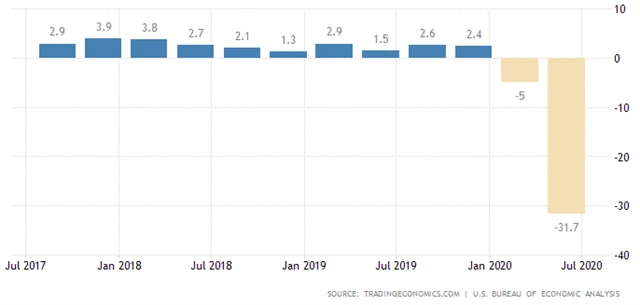 Americká ekonomika ve druhém čtvrtletí kvůli dopadům šíření nemoci covid-19 zažila nejhlubší propad v historii. Hrubý domácí produkt se v přepočtu na celý rok podle zpřesněných údajů snížil o 31,7 %. Výsledek je však nakonec lepší, než čekali analytici, kteří předpovídali po prvním odhadu propad HDP o 32,5 %. Vývoj ovlivnil především citelný propad spotřebitelských výdajů. Spojené státy za sebou mají rekordně dlouhou ekonomickou expanzi, která trvala od roku 2009.