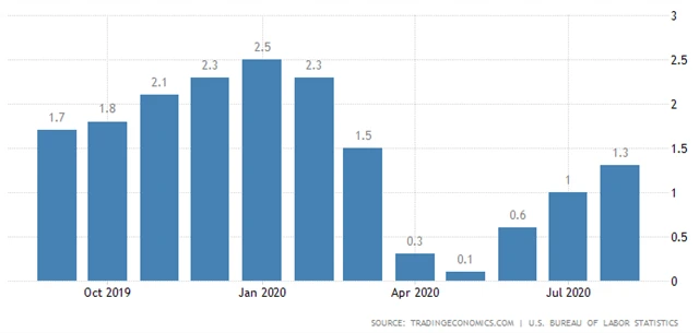 Spotřebitelské ceny ve Spojených státech v srpnu meziročně vzrostly o 1,3 %. V předchozím měsíci se zvýšily o procento. Jejich růst tak zrychlil již třetí měsíc v řadě. Ve srovnání s červencem ceny stouply o 0,4 %.
