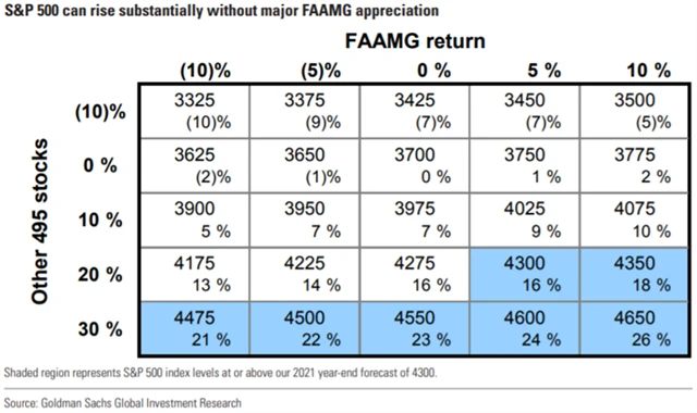 Znepokojení nejsou analytici z Goldman Sachs ani velkou koncentrací indexu S&P 500. Pokud by akcie pěti firem s největší váhou (Facebook, Apple, Amazon, Alphabet, Microsoft) stagnovaly a cenné papíry zbylých firem v S&P 500 rostly historicky mediánovým tempem 12 %, celý index by se za rok zvýšil o 9 %.