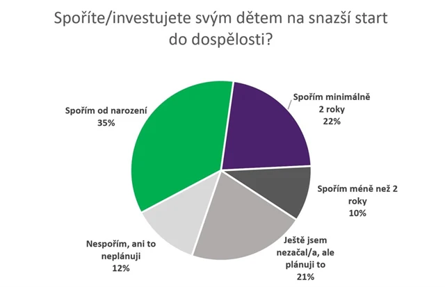 Na snazší start do života, na bydlení nebo studia. Ať na cokoli, svým dětem spoří nebo investuje 67 % rodičů, další zhruba pětina (21 %) zatím stranou nic neodkládá, ale má to v plánu. Jen asi 12 % dotázaných, kteří mají děti, jim nespoří, neinvestují a ani to neplánují.