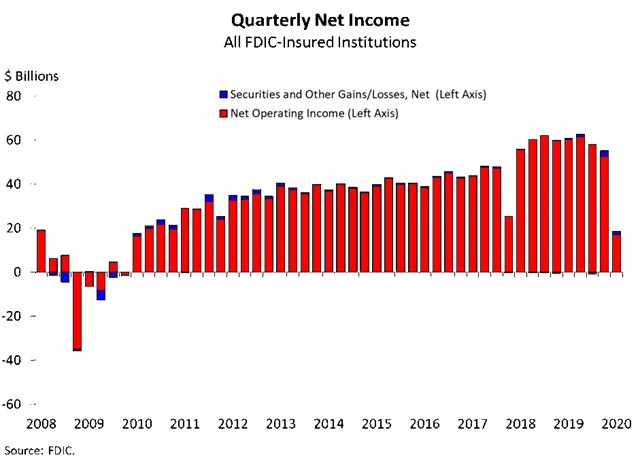 Zisk amerických bank v prvním čtvrtletí roku klesl meziročně o 69,6 procenta na 18,5 miliardy USD. Banky tak výrazně pocítily dopad koronavirové pandemie. Zhoršení ekonomické aktivity způsobilo, že dlužníci začali mít problémy se splácením úvěrů a banky musely vyčlenit miliardy dolarů do rezerv na ztrátové úvěry. Uvedla to Federální společnost pro pojištění vkladů (FDIC).