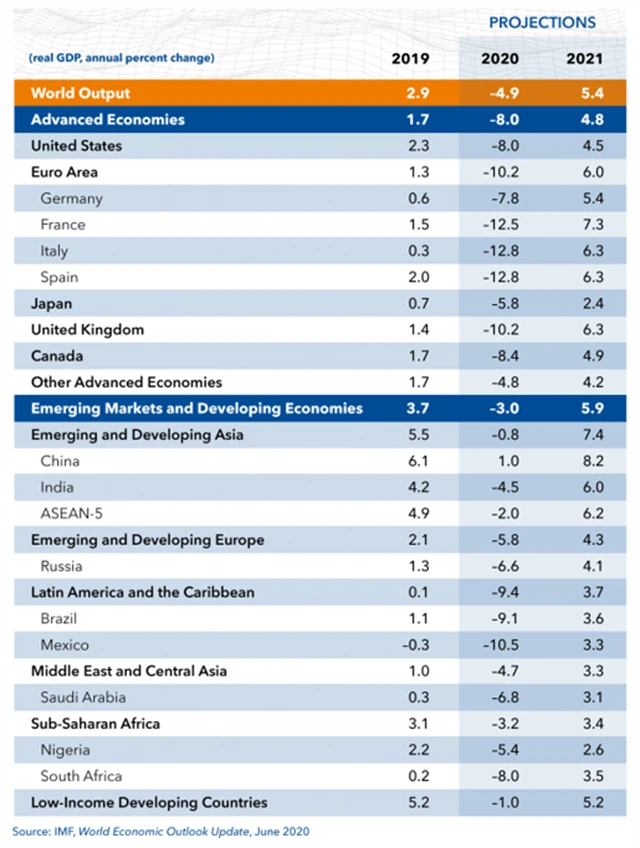 V letošním roce měnový fond poprvé očekává pokles ve všech regionech, i když jeho míra se bude v jednotlivých ekonomikách výrazně lišit. Záležet bude na vývoji pandemie, schopnosti zemí dostat pod kontrolu šíření nákazy, dále na struktuře ekonomik a jejich závislosti na jednotlivých sektorech, zvláště na turismu a ropě, či na růstových trendech před krizí.