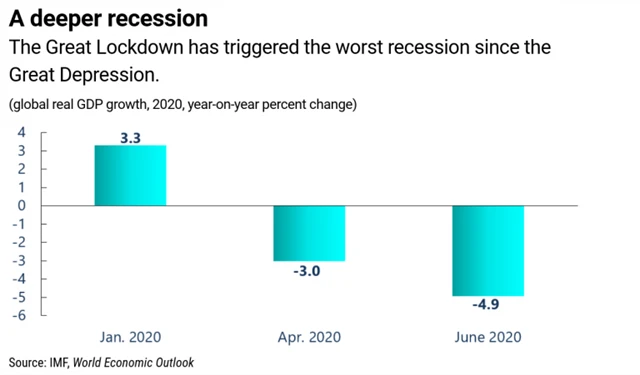 Mezinárodní měnový fond kvůli dopadům pandemie nemoci covid-19 dále zhoršil výhled vývoje globální ekonomiky. Pro letošní rok nově počítá s propadem světového HDP o 4,9 %. V dubnu čekal pokles o tři procenta, přičemž i to by znamenalo nejhlubší recesi globální ekonomiky za 90 let.