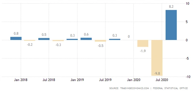 Příští rok čeká německá vláda růst ekonomiky o 4,4 %. Aktualizace údajů na letošní rok znamená, že Německo sice prochází jednou z nejhorších hospodářských krizí od konce druhé světové války, nicméně si vede lépe než po finanční krizi v roce 2009.