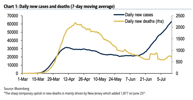 Počty úmrtí na COVID-19 v USA stagnují při rychlém růstu počtu nově nakažených