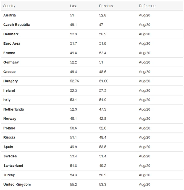 PMI ve výrobě (srpen 2020), zdroj: tradingeconomics.com