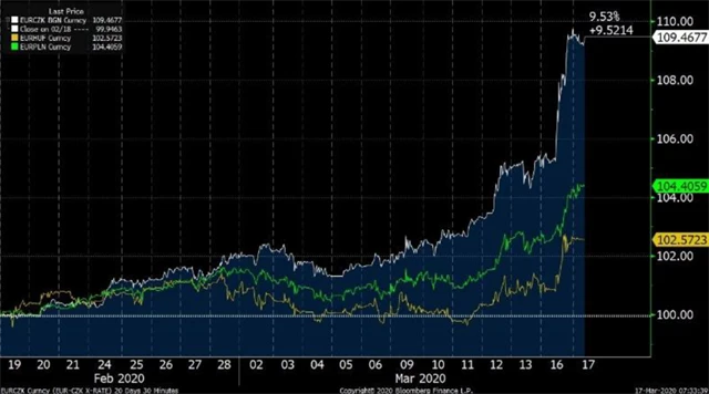 Koruna po pondělním rozhodnutí ČNB oslabila o dobré procento. Za poslední měsíc (což je zhruba doba, která uplynula od vyhřeznutí epidemie koronaviru mimo Čínu) oslabila celkově již zhruba o 10 %, což je podstatně více než polský zlotý (asi -4 %) a maďarský forint (asi -3 %).