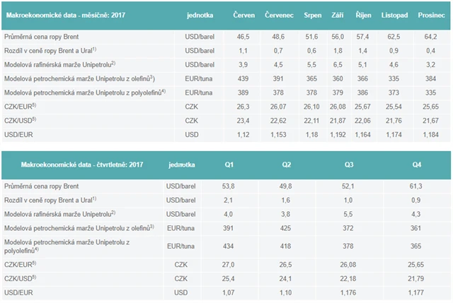 Petrochemický holding Unipetrol zveřejnil modelové marže za prosinec. V rafinérském segmentu se marže snížila z 4,6 USD na barel v listopadu na 3,2 USD. Rozdíl mezi cenami ropy Brent a Ural klesl z 0,9 USD na 0,4 USD na barel. Olefinová marže dosáhla 384 eur na tunu (listopad: 335 eur) a polyolefinová marže byla 335 eur na tunu (listopad: 373 eur). Zveřejněny byly zároveň i marže za celé čtvrté čtvrtletí.