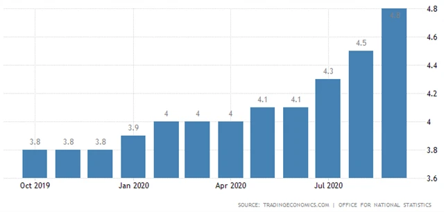 Míra nezaměstnanosti v Británii v tříměsíčním období do konce září vystoupila na 4,8 %, což znamená čtyřleté maximum. V předchozím tříměsíčním období do konce srpna činila 4,5 %. Oznámil to v úterý britský statistický úřad. O práci přišlo za třetí čtvrtletí rekordních 314 000 lidí.
