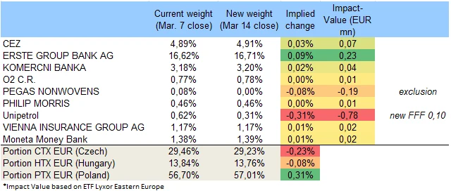 Ve srovnávacím indexu CECE EUR mírně klesne váha českých akcií. Sníží se váha akcií petrochemické společnosti Unipetrol a vyřazeny z indexu budou cenné papíry výrobce netkaných textilií Pegas Nonwovens. Zvýší se naopak váha akcií finanční skupiny Erste Group Bank. Ke změnám dojde 14. března po konci obchodování.