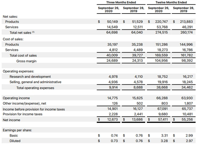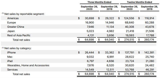 Celkové tržby společnosti Apple se ve čtvrtletí, které skončilo 26. září, zvýšily na 64,7 miliardy dolarů ze zhruba 64 miliard dolarů před rokem, ačkoli analytici podle společnosti Refinitiv předpovídali pokles na 63,7 miliardy dolarů. Tržby z prodeje telefonů iPhone se propadly o 20,7 % na 26,4 miliardy dolarů, zatímco analytici pokles odhadovali pouze na 16,2 %.