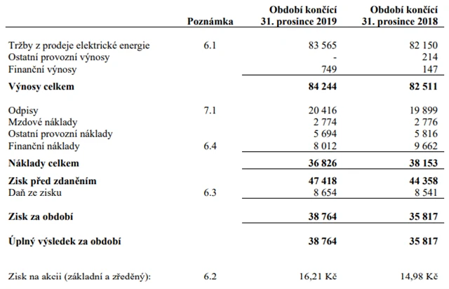 Zisk před zdaněním se loni společnosti zvýšil na 47,4 milionu Kč z 44,4 milionu Kč v roce 2018. Na dani ze zisku firma odvedla 8,7 milionu Kč po 8,5 milionu Kč v roce 2018. Celkové náklady firmy loni dosáhly 36,8 milionu Kč, v roce 2018 to bylo 38,2 milionu Kč. Z toho odpisy loni tvořily 20,4 milionu Kč, finanční náklady 8 milionů Kč, mzdové náklady 2,8 milionu Kč a ostatní provozní náklady 5,7 milionu Kč.