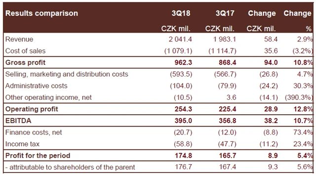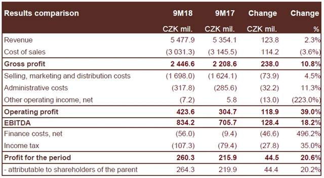 Za samotné třetí čtvrtletí skupina vykázala tržby dvě miliardy korun (meziročně +2,9 %), provozní zisk EBITDA 395 milionů korun (meziročně +10,7 %) a čistý zisk 174,8 milionu korun (meziročně +5,4 %).