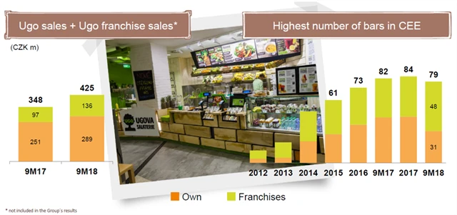 Velice dobře opět vyzněly výsledky fresh barů a salaterií UGO. Tržby v tomto segmentu, včetně prodeje produktů UGO mimo stejnojmenné provozovny, stouply z 348 milionů Kč na 425 milionů Kč. Celkový počet provozoven UGO přitom meziročně klesl z 82 na 79. Na konci roku 2017 měla síť UGO 84 provozoven.