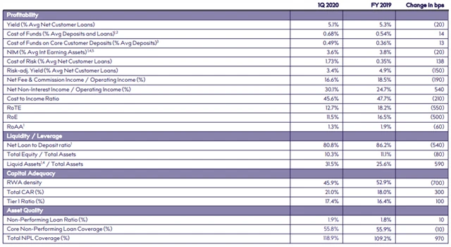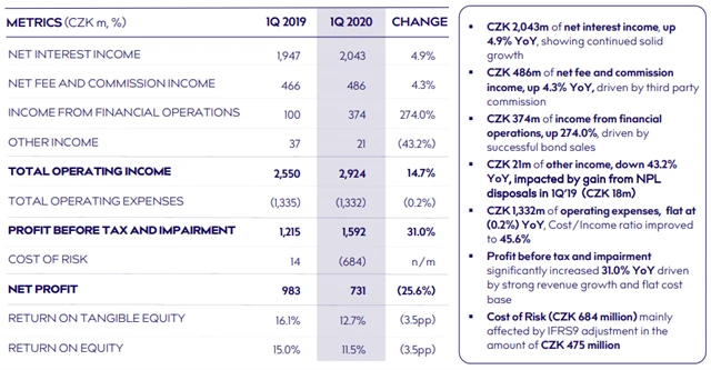 Čistá úroková marže dosáhla v prvním čtvrtletí 3,6 % oproti 3,8 za loňský rok. Společnost má nadále silnou kapitálovou pozici, poměr Tier 1 dosahoval na konci prvního čtvrtletí 17,4 %, na konci roku 2019 byl na úrovni 16,4 %.