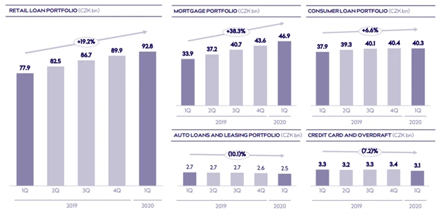 Bilance hrubých retailových úvěrů se meziročně zvýšila o 19,2 % na 92,8 miliardy Kč, a to mimo jiné díky růstu hypotéčních úvěrů o 38,3 % na 46,9 miliardy Kč. Bilance hrubých úvěrů poskytnutých podnikům se meziročně zvýšila o 5,8 % na 68,4 miliardy Kč, z toho objem úvěrů pro malé firmy se zvýšil o 40,4 % na 7,2 miliardy Kč.