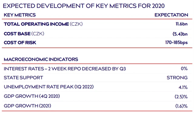 Ve výhledu pro letošní rok MONETA uvedla, že očekává celkové provozní výnosy 11,6 miliardy korun. Náklady by podle banky měly dosáhnout 5,4 miliardy korun a náklady na rizika by se měly pohybovat mezi 170 a 185 bazickými body ve vztahu k průměrnému objemu celkového úvěrového portfolia. Dosud banka počítala s provozními výnosy 12,5 miliardy korun. Dividendovou politiku plánuje banka revidovat v třetím čtvrtletí s ohledem na aktuální ziskovost, kapitál a likviditu banky. "Z důvodů nejasností ekonomických důsledků pandemie covidu-19 byl rovněž pozastaven zpětný odkup akcií," uvedla také společnost.