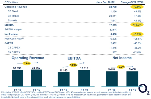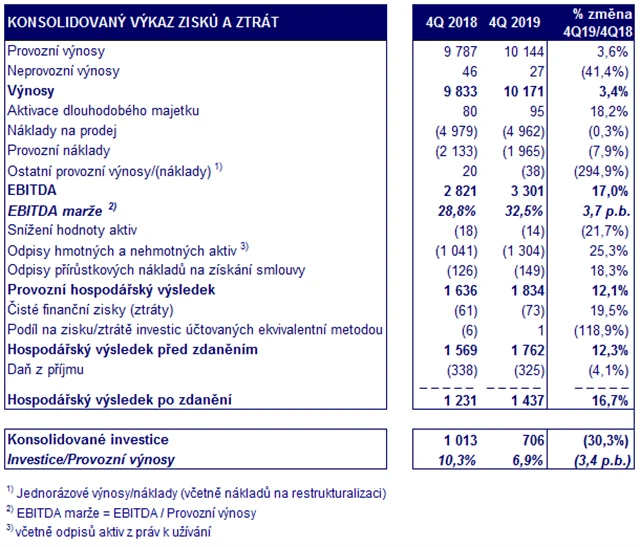 Konsolidovaný provozní zisk EBITDA vzrostl v roce 2019 meziročně o 13 % na 12,62 miliardy Kč díky růstu výnosů, meziročně stejným celkovým nákladům a pozitivnímu vlivu nového účetního standardu IFRS 16. V ČR vzrostl provozní zisk EBITDA o 11,8 % na 9,51 miliardy Kč, na Slovensku se zvýšil o 18,7 % na 3,15 miliardy Kč (+18,6 % na 123 milionů eur). Konsolidovaná EBITDA marže vzrostla meziročně o 3,2 procentního bodu, a za celý loňský rok tak dosáhla 32,6 %.