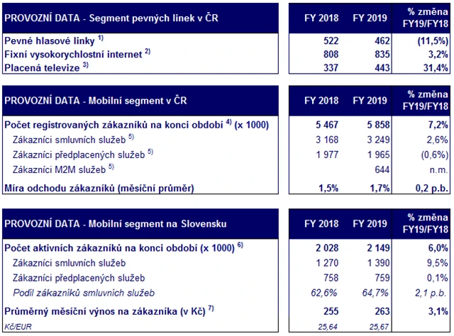Celkový počet mobilních registrovaných zákazníků v ČR na konci roku činil 5,86 milionu. Zákaznická báze mobilních smluvních služeb byla k 31. prosinci 2019 na úrovni 3,25 milionu, počet zákazníků mobilních předplacených služeb byl 1,97 milionu.