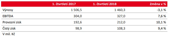 Provozní výsledek hospodaření EBIT činil v prvním čtvrtletí 212 milionů Kč, ve srovnání s prvním čtvrtletím 2017 tak byl vyšší o 10,1 %.