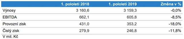 Provozní výsledek hospodaření EBIT v první polovině roku činil 353,2 milionu Kč, a byl tak o 18 % slabší než ve stejném období roku 2018.