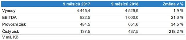 Zisk EBIT za prvních devět měsíců roku dosáhl 651,6 milionu Kč (+34,5 %) a čistý zisk vyskočil o 218,2 % na 437,5 milionu Kč. Prudký růst čistého zisku byl dán hlavně lepším provozním hospodařením na úrovni EBITDA a vykázanými nerealizovanými kurzovými změnami.
